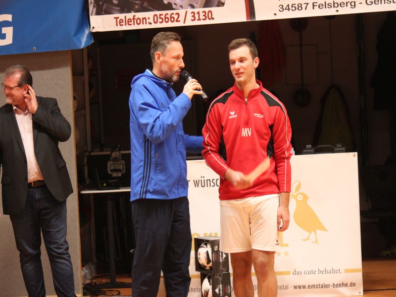 TSV Kapitän Philipp Prantschke nimmt den "Scheck" und einen Spielball für den 2. Platz im Empfang. Aufmerksame Beobachter: Luca und Niklas Döhne (v.l.)