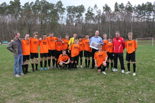 Im Anschluss an das Spiel bedanken sich Mannschaft und Vorstand bei Hr. F. Müller die Spende der Trainingsbälle für die Jungs und überreichten durch Abteilungsleiter T.Heist ein Mannschaftsfoto.