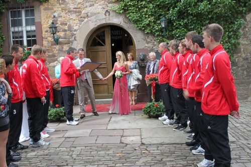 Heute Nachmittag gaben sich unser Trainer Marco Althans und seine langjährige Lebensgefährtin Melanie Kleine das "Ja" Wort. Eine Delegation von Vorstand und Spielern ließen es sich nicht nehmen, das frisch getraute Paar direkt nach der Standesamtlichen Trauung vor der Trendelburg mit einem Spalier und einem kleinen Präsent zu überraschen. Die Abteilungsführung und alle aktiven Spieler der Abteilung wünschen Melanie und Marco, die sich inzwischen auf Hochzeitsreise befinden, für ihren gemeinsamen Lebensweg alles erdenklich Gute und viel Glück.