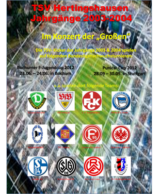 Für die TSV-Kicker der Jahrgänge 2003-2004 stehen in diesem Jahr zwei Hihglights auf dem Turnierplan. Am 23.06.-24.06.12 geht es nach Bochum zu"Bochumer F-Jugendcup". Vom 28.09.-30.09.12 reist dann das Team nach Stuttgart zum Punica-Cup. Auf beiden Turnieren geht es gegen zahlreiche Bundesliganachwuchsteams, von VFB Stuttgart,Schalke 04, Eintracht Frankfurt, 1 FC. Kaiserlautern u.a. .Sportlich wird es für die jungen Kicker schwer was zu " reissen", was aber bei solchen Veranstaltungen gar nicht im Vordergrund steht, vielmehr solle die Jungs dabei Erlebnisse und Erfahrungen sammeln. Am 30.06. geht es dann noch zum Lukas-Podolski-Cup nach Köln, wo man als Titelverteidiger anreist.